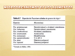 Este documento trata sobre los cereales y su importancia como alimento humano. Incluye una lista de los principales cereales como el trigo, maíz, arroz y otros. Describe los procesos de recolección, almacenamiento y procesamiento de los cereales, así como los microorganismos como hongos y bacterias que pueden afectarlos. Explica cómo factores como la humedad, temperatura y tiempo afectan el crecimiento microbiano en los cereales.