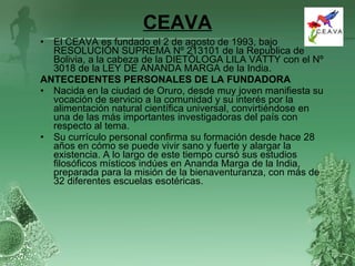 El CEAVA fue fundado en 1993 en Bolivia por la dietista Lila Vatty para promover la alimentación orgánica y los cereales andinos. Ofrece capacitación en agronomía orgánica, producción de alimentos, dietas saludables y más, con el objetivo de mejorar la nutrición y economía de las comunidades andinas. Los cereales andinos más importantes son la quinua, kiwicha, tarwi, cañahua y amaranto, ricos en proteínas y otros nutrientes.