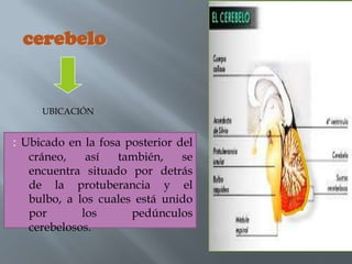 El cerebelo se ubica en la fosa posterior del cráneo detrás de la protuberancia y el bulbo. Tiene forma ovoide aplanada y está compuesto de sustancia gris en la corteza y sustancia blanca en el interior. Una de sus principales funciones es contribuir al control de los movimientos voluntarios mediante la regulación y coordinación de la contracción muscular.