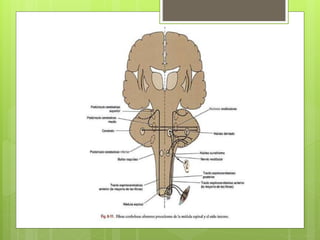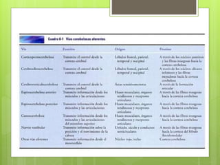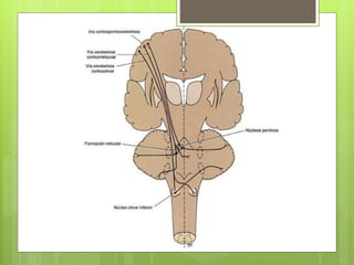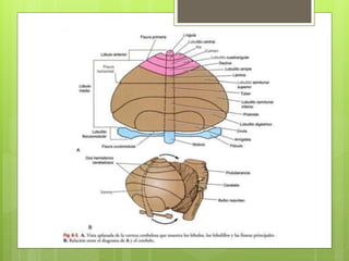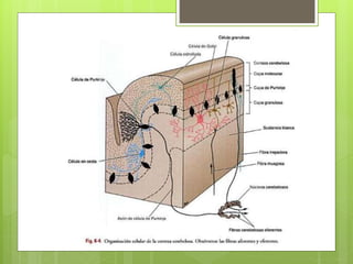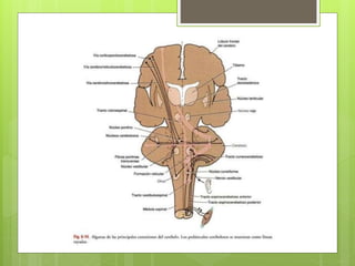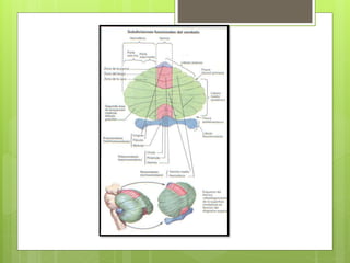 El documento describe la anatomía y función del cerebelo. El cerebelo se ubica en la fosa craneal posterior y está compuesto de sustancia gris cortical y sustancia blanca interna. Recibe información aferente de diversas fuentes y coordina el movimiento a través de conexiones eferentes con núcleos del tronco encefálico y la médula espinal. Las lesiones cerebelosas producen síntomas como ataxia, trastornos de la postura y el equilibrio.