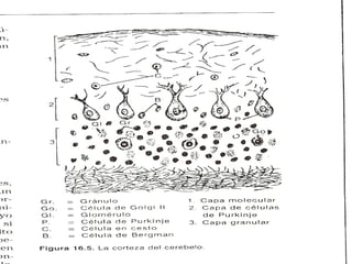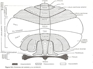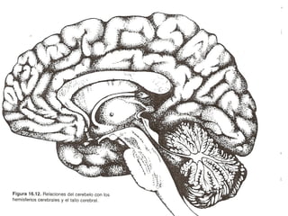 El documento describe la anatomía del cerebelo. Señala que el cerebelo se origina en la quinta semana embrionaria y tiene tres pedúnculos cerebelosos que lo conectan al mesencéfalo, protuberancia y bulbo raquídeo. Internamente tiene una corteza gris que recubre la sustancia blanca y cuatro pares de núcleos cerebelosos. El documento también discute la filogenia, anatomía microscópica y conexiones del cerebelo.