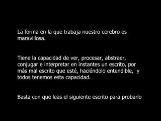 El documento describe la capacidad increíble del cerebro humano para procesar y comprender información a pesar de errores ortográficos o de otra índole. Se incluyen varios ejemplos que demuestran cómo el cerebro puede entender el significado general de un texto aunque las letras dentro de las palabras estén desordenadas o haya errores de escritura. El cerebro se enfoca en el significado completo de las palabras y la información general del texto.