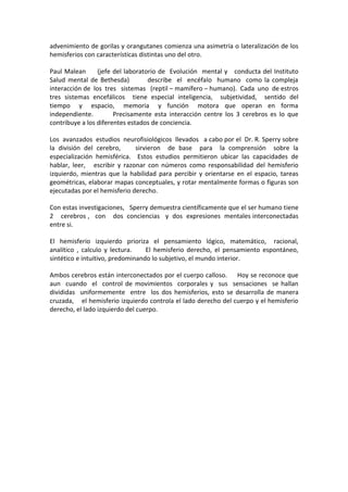 El documento describe el funcionamiento del cerebro humano, incluyendo sus tres componentes principales (cerebro, cerebelo y sistema límbico), la evolución del cerebro a través del tiempo, y las funciones especializadas de cada hemisferio cerebral. Explica que el cerebro se ha vuelto más complejo a través de la evolución, agregando nuevas estructuras como el neocortex y el sistema límbico que permiten funciones más avanzadas como las emociones y el pensamiento abstracto.