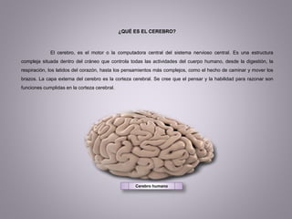 El documento proporciona información sobre el cerebro y las neuronas. Explica que el cerebro controla todas las actividades del cuerpo desde la digestión hasta los pensamientos más complejos, y que la corteza cerebral se cree que es responsable del razonamiento. Describe la estructura de la neurona y cómo se comunican mediante sinapsis. También cubre temas como la materia blanca y gris del cerebro, las diferentes regiones cerebrales como el prosencéfalo, y el metabolismo cerebral, incluida la glucólisis.