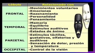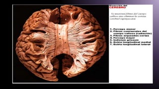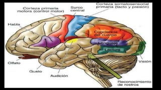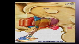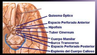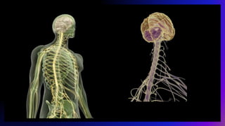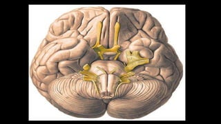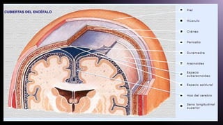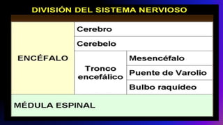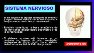 El documento describe el sistema nervioso. Se compone de órganos que controlan y regulan la relación con el medio externo e integran el medio interno. El sistema nervioso central incluye el encéfalo y la médula espinal, protegidos por las meninges. El encéfalo contiene el cerebro, cerebelo, diencéfalo y tronco encefálico.