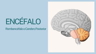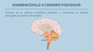 El documento proporciona información sobre la anatomía del rombencéfalo o cerebro posterior. El rombencéfalo incluye la médula oblongada, el puente y el cerebelo. Describe las características de cada una de estas estructuras, incluida su configuración externa e interna, los núcleos de la sustancia gris y su relación con los nervios craneales. También describe el cuarto ventrículo que se encuentra entre estas partes del rombencéfalo.