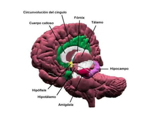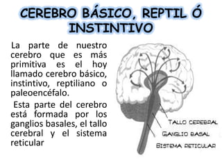 El documento describe la teoría del cerebro triuno, el cual consta de tres partes: el cerebro reptiliano (instintos básicos), el cerebro límbico (emociones) y la neocorteza (pensamiento racional). Cada parte controla funciones específicas y tiene implicaciones para la conducta humana y el aprendizaje. La teoría provee un marco para entender la interacción entre las diferentes áreas cerebrales y cómo esto puede aplicarse en el contexto educativo.