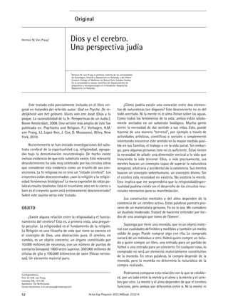 El documento discute la relación entre la religiosidad y el funcionamiento del cerebro desde una perspectiva judía. Explica que aunque la religiosidad depende del cerebro, ambos son entidades distintas. El cerebro permite la existencia de la mente y el alma pero no determina sus atributos. La religiosidad tiene componentes genéticos y ambientales, siendo la carga genética mayor para la religiosidad intrínseca. También resume algunos hallazgos de investigaciones sobre la herencia de la espiritualidad y la susceptibilidad religiosa.