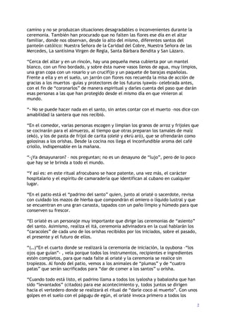 La ceremonia de iniciación en la religión Yoruba dura siete días y consta de tres pasos: el asentamiento del santo en la cabeza del iniciado, el Día del Medio y la lectura del Itá. En la ceremonia descrita, se describe el proceso de preparación para asentar el santo en dos personas, incluyendo la limpieza del espacio, ofrendas a los muertos y orishas, y la cocina de alimentos que se ofrecerán. Finalmente, se lleva a cabo la ceremonia de asentar el santo dirig