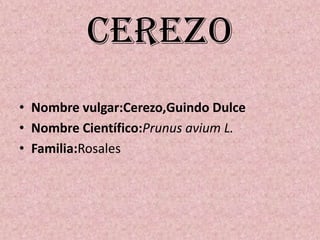 El cerezo es un árbol que necesita frío para crecer adecuadamente. Crece mejor en suelos profundos, húmedos y calizos, requiriendo riego regular si el suelo es seco. Produce frutos comestibles y flores que se usan en medicina, mientras que su madera es valiosa. Requiere poda, fertilización y cuidados apropiados para prosperar.