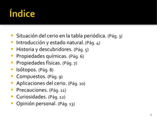 El documento resume las propiedades y aplicaciones del cerio. El cerio es un metal gris que se oxida a un color marrón-rojizo cuando está expuesto al aire. Fue descubierto en 1803 y se encuentra en minerales como cerita, monacita y blastnasita. Se usa en mecheros debido a su buena conductividad térmica y eléctrica, y sus óxidos se usan como catalizadores y en pulido de vidrio. El cerio puede ser tóxico si se inhala su humo o polvo.