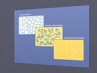 El documento describe diferentes sistemas cerámicos utilizados en odontología, incluyendo sistemas metálicos cerámicos, cerámicas convencionales y modernas. Las cerámicas feldespáticas tienen buena estética pero malas propiedades mecánicas, mientras que las cerámicas modernas están reforzadas con cristales para mejorar su resistencia. Los sistemas más avanzados incluyen cerámicas de alúmina, espinela y circonio, que ofrecen excelentes propiedades mecánicas.