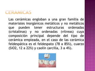 Este documento describe las cerámicas feldespáticas, que son materiales inorgánicos compuestos principalmente de feldespato, cuarzo y caolín. Explica que las cerámicas feldespáticas tienen dos fases, vítrea y cristalina, y son usadas principalmente para carillas dentales debido a su estética excelente. Sin embargo, carecen de resistencia a tensiones y son propensas a fracturarse. También describe cómo han evolucionado los materiales cerámicos para desarrollar cerámicas feldespáticas de alta resist