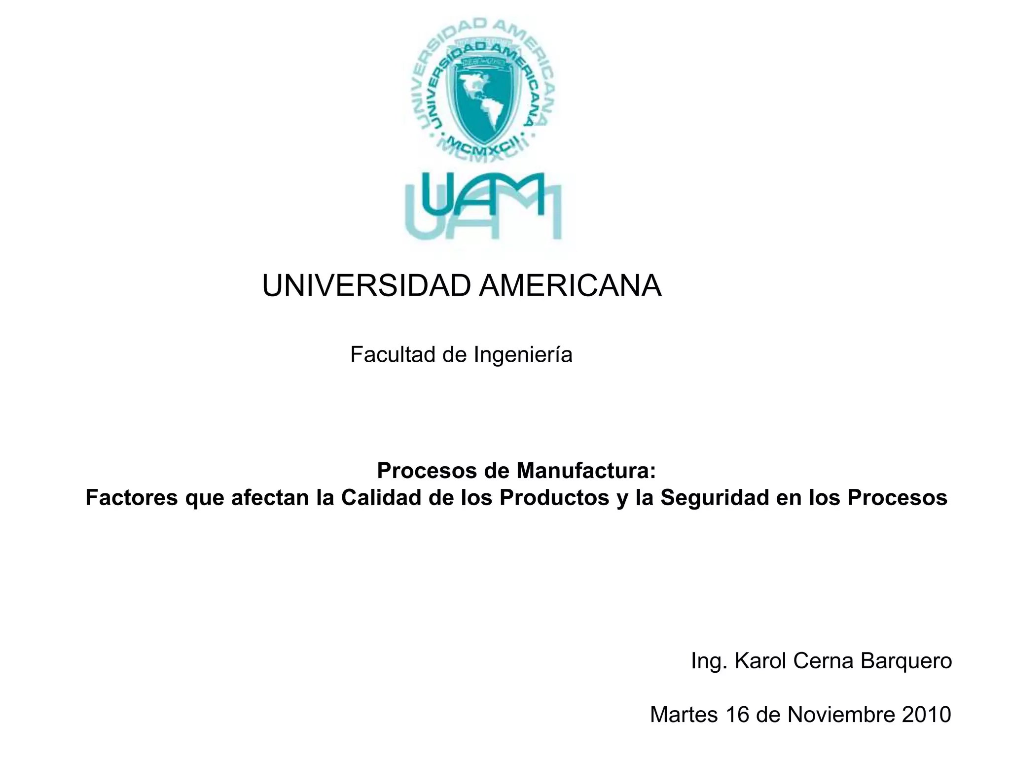 El documento describe los factores que afectan la calidad y seguridad en los procesos de manufactura. Explica que la administración, empleados, materiales, procesos e instalaciones influyen en la calidad. También cubre factores relacionados con la calidad como las dimensiones técnica, humana y económica. Finalmente, analiza factores que impactan la seguridad como la responsabilidad, orden y limpieza, y manejo adecuado de herramientas.