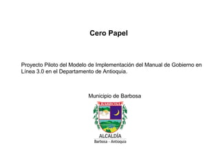 Este documento presenta un proyecto piloto para implementar un modelo de gobierno en línea en el departamento de Antioquia, Colombia. El objetivo es validar que el modelo se adapte a las entidades territoriales y ayude a identificar las actividades e instrumentos necesarios para su implementación en el resto del país. También describe una estrategia para promover oficinas cero papel con el fin de reducir el uso de papel en actividades administrativas e implementar una política de cero papel a nivel gubernamental y más allá.