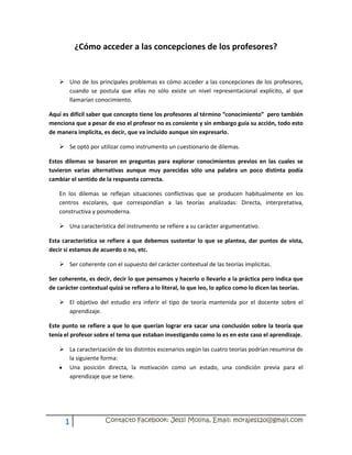 El documento analiza las concepciones de los profesores sobre el aprendizaje y cómo acceder a ellas. Se utilizó un cuestionario de dilemas basado en situaciones escolares que reflejaban diferentes teorías como la directa, interpretativa, constructiva y posmoderna. La teoría más elegida por los profesores fue la constructiva. El estudio concluye que los profesores no se adhieren únicamente a una teoría, sino que toman aspectos de varias y que su experiencia en el aula influye en sus concepciones.