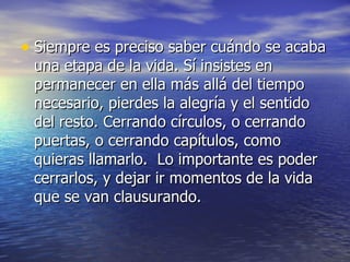 Este documento trata sobre la importancia de saber cerrar etapas en la vida y dejar ir momentos y relaciones del pasado. Aconseja no aferrarse al pasado y en cambio vivir plenamente el presente. También enfatiza que nada ni nadie es indispensable y que es un proceso aprender a desprenderse para seguir adelante con tranquilidad.