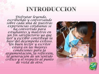 Este documento describe la experiencia del programa Palabrario en una escuela secundaria en Colombia. Explica que Palabrario ha ayudado a estudiantes y maestros a mejorar sus habilidades de lectura y escritura a través de actividades como la decoración de cuadernos con escritos basados en cuentos, canciones y otros textos. También destaca que los estudiantes han mostrado mejoras en comprensión lectora y producción de textos, lo que se refleja en mejores resultados en exámenes.