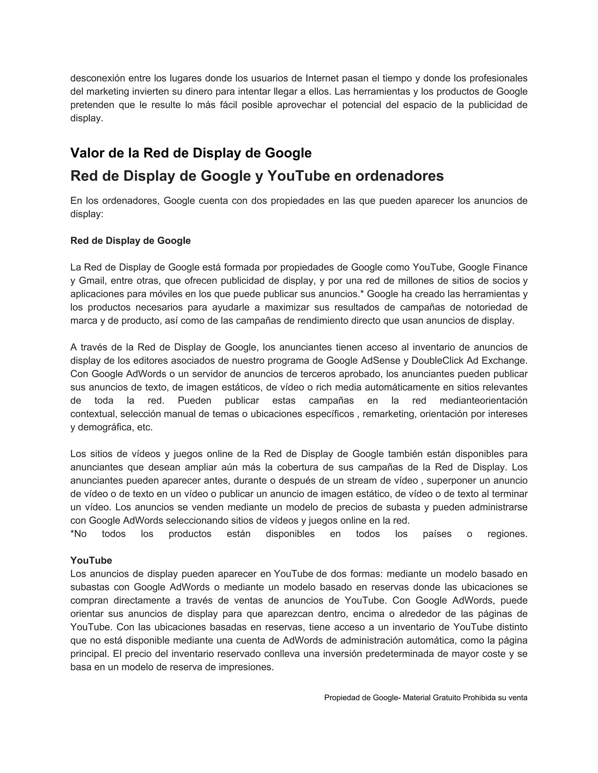 El documento describe los beneficios de la publicidad de display y la Red de Display de Google. La publicidad de display puede utilizarse para objetivos de branding y respuesta directa y llega a consumidores en todas las etapas del embudo de compra. La Red de Display de Google permite a los anunciantes llegar a una gran audiencia a través de cientos de miles de sitios web y aplicaciones con herramientas para medir y optimizar las campañas.