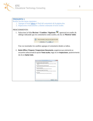 Este documento sirve como guía de estudio para la certificación MCAS en Word 2007. Explica el proceso para realizar 19 preguntas con diferentes tareas como aplicar estilos, insertar encabezados, tablas de contenido, comparar documentos, buscar y reemplazar texto, y proteger y guardar el documento.