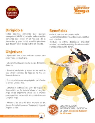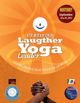 Este documento describe una certificación internacional de líder de yoga de la risa de 16 horas de duración. La certificación se llevará a cabo en Monterrey, Nuevo León, México del 28 al 29 de septiembre de 2013. Cubrirá temas como la historia de la risa terapéutica y el yoga de la risa, cómo dirigir sesiones de yoga de la risa, y las cualidades de un líder efectivo. Obtendrá un certificado internacional y un descuento en sesiones individuales de yoga de la risa. El