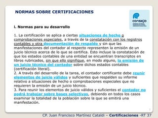 El documento presenta normas sobre certificaciones contables según la Resolución Técnica 37 de la Federación Argentina de Consejos Profesionales de Ciencias Económicas. Se definen las normas para el desarrollo de certificaciones, incluyendo que no requieren emitir un juicio técnico sino constatar hechos con documentación de respaldo. También se establecen normas sobre el contenido de las certificaciones, como el título, destinatario, alcance, información certificada y manifestación del contador.