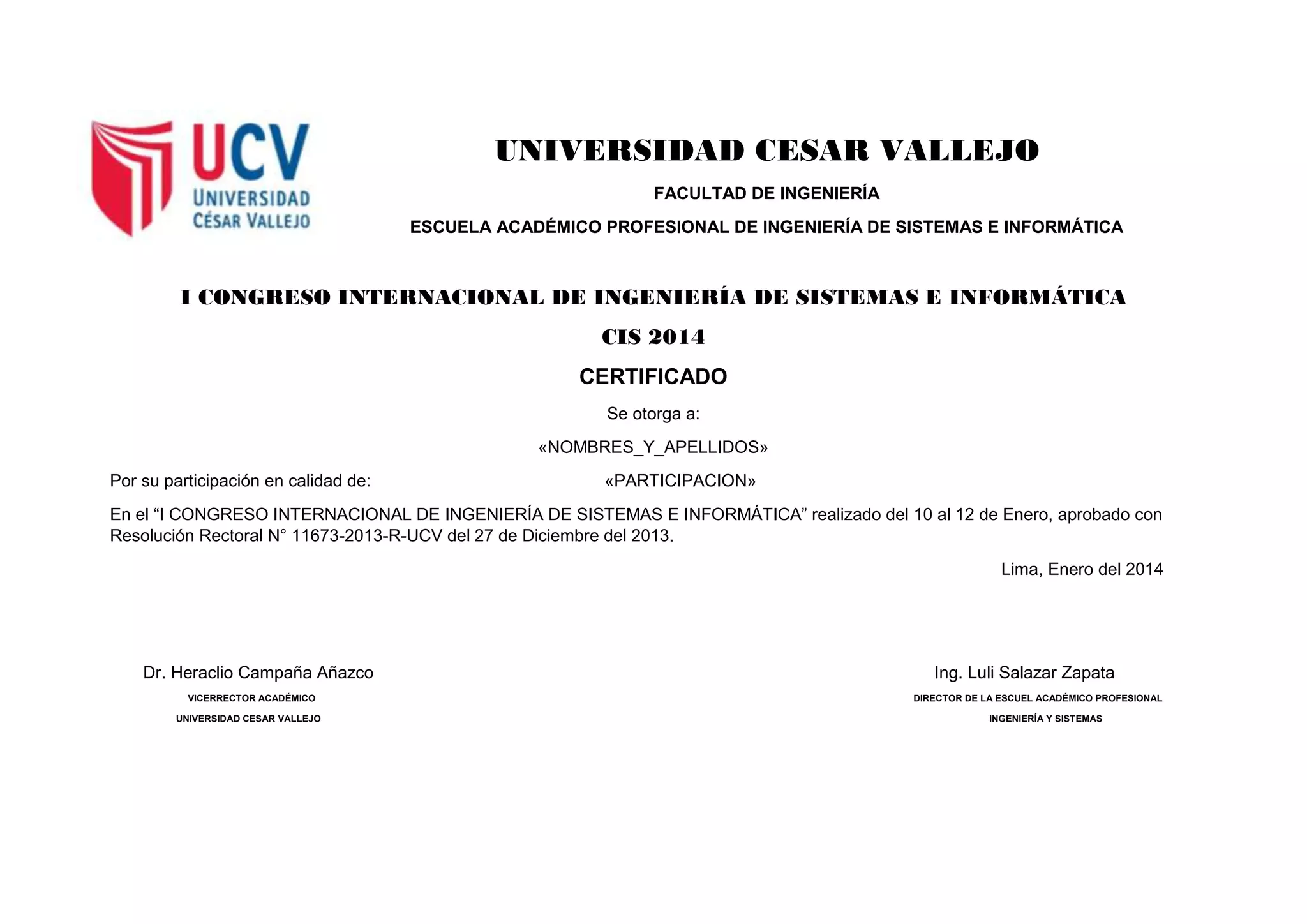 Este certificado reconoce la participación de un individuo en calidad de conferencista/expositor/asistente en el Primer Congreso Internacional de Ingeniería de Sistemas e Informática organizado por la Universidad Cesar Vallejo del 10 al 12 de enero de 2014.