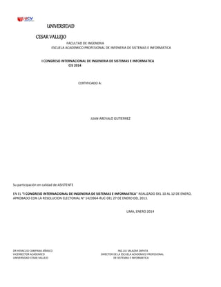 El documento contiene certificados de participación en el Primer Congreso Internacional de Ingeniería de Sistemas e Informática realizado en enero de 2014 por la Universidad Cesar Vallejo. Los certificados reconocen la participación de varias personas en calidades como asistente, organizador, invitado y ponente.