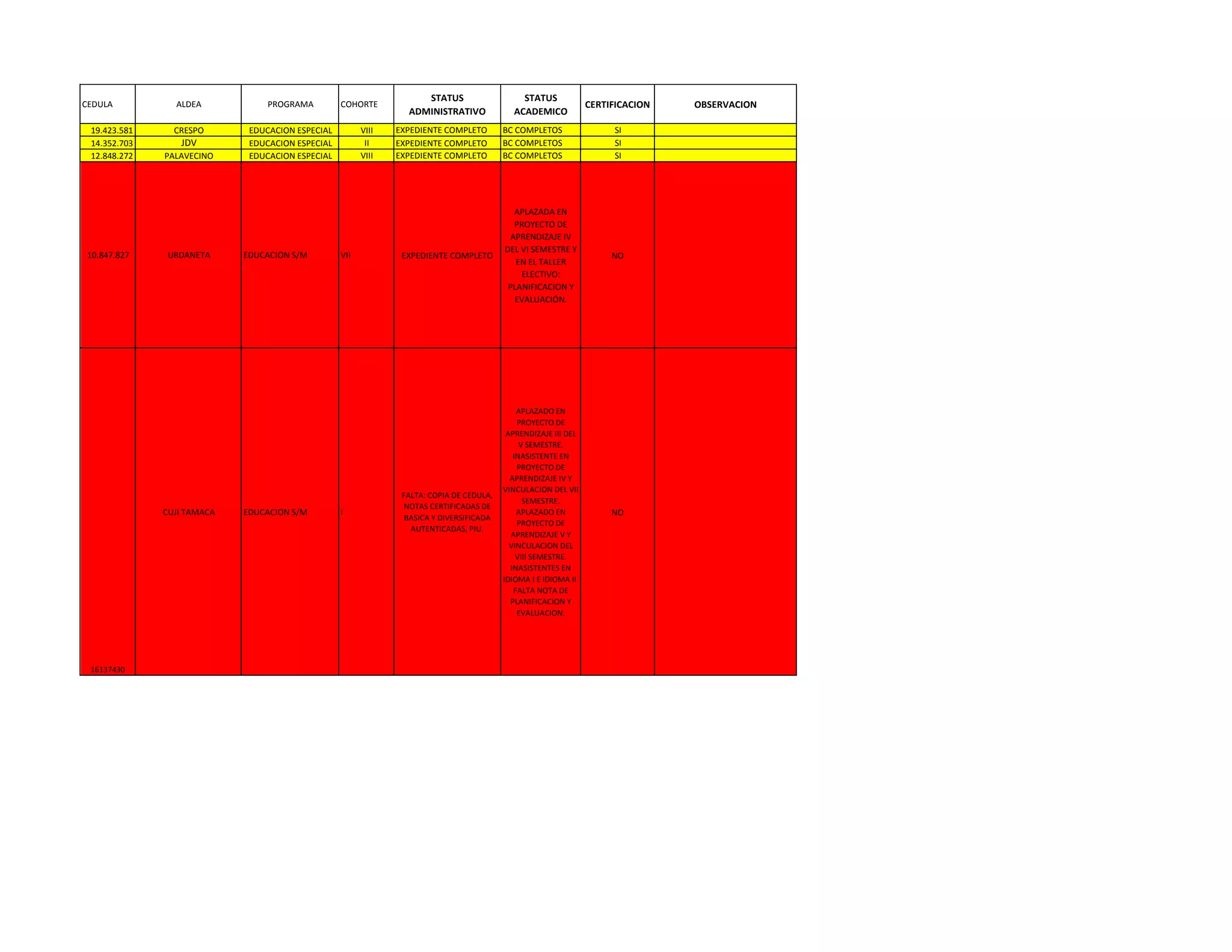 El documento presenta información sobre 44 estudiantes de diferentes programas de educación en Venezuela. Incluye datos como el número de cédula, colegio de procedencia, programa, estatus académico y administrativo, certificaciones y observaciones. La mayoría de los estudiantes tienen su expediente completo y notas certificadas, aunque algunos presentan faltantes o retrasos académicos.
