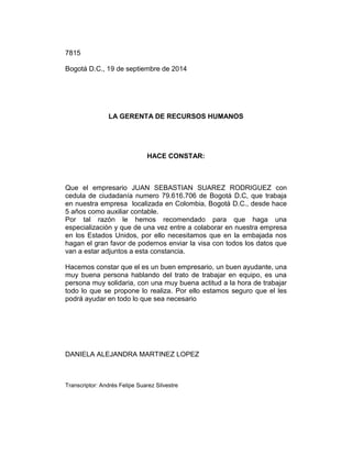 El documento es una constancia laboral emitida por la gerenta de recursos humanos de una empresa. La constancia certifica que Nohora Mireya Herrera López ha trabajado en la empresa durante 8 años como asistente administrativa y detalla su horario laboral. Adicionalmente, la constancia fue emitida para cumplir con los requerimientos de la EPS Famisanar.