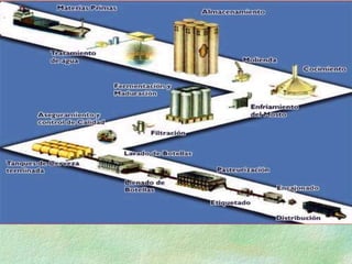El documento describe el proceso de producción de cerveza. La cerveza se produce a través de varias etapas que incluyen molienda de malta, cocción del mosto, fermentación y filtración. Cada etapa sigue procesos automatizados y de alta tecnología para garantizar la calidad del producto final. La cerveza también se somete a controles de calidad antes de ser envasada y distribuida.