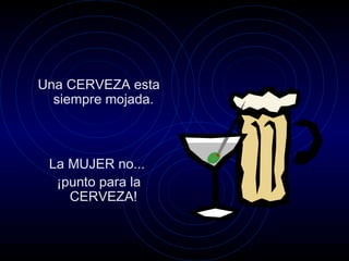 El documento presenta una serie de comparaciones humorísticas entre la cerveza y las mujeres, atribuyendo puntos a uno u otro lado por diferentes criterios como la temperatura, los efectos del alcohol, las consecuencias legales y sociales de su consumo, entre otros. Al final, la cuenta da como ganadora a la cerveza por un marcador de 11-7.