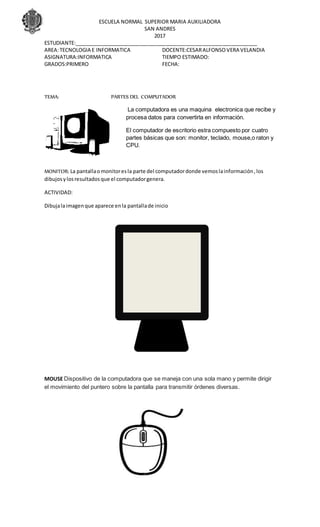 Este documento describe las cuatro partes básicas de una computadora de escritorio: el monitor, el teclado, el mouse y la CPU. Explica que el monitor muestra la información, los dibujos y los resultados generados por la computadora, el mouse se usa para dirigir el puntero en la pantalla, la CPU procesa los datos y el teclado permite introducir información a través de teclas como en una máquina de escribir.