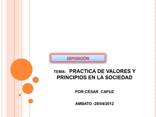 El documento discute la importancia de practicar valores y principios en la sociedad. Explica que los valores son fundamentales para una convivencia civilizada y permiten una vida equilibrada. Clasifica los valores y analiza los resultados de una encuesta sobre valores realizada a estudiantes. Concluye recomendando fortalecer los vínculos familiares y crear códigos de convivencia que promuevan valores como la prudencia, el respeto y la solidaridad.