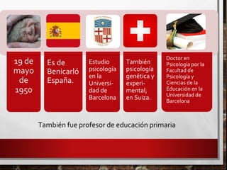 Este documento resume la vida y obra del psicólogo español César Coll. Estudió psicología en la Universidad de Barcelona y también en Suiza. Es doctor en psicología y profesor de educación primaria. Se inspira en Jean Piaget y tiene una visión constructivista de la enseñanza y el aprendizaje. Propone el "triángulo interactivo" entre el alumno, el maestro y los contenidos como modelo para la construcción del conocimiento en la escuela. Defiende que el aprendizaje es un proceso permanente de