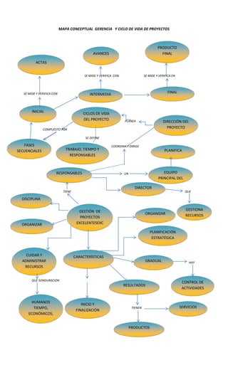 Este documento presenta un mapa conceptual sobre la gerencia y ciclo de vida de proyectos de tecnología educativa. La gerencia de proyectos se define como la planificación, coordinación y dirección de un proyecto a través de sus fases secuenciales, incluyendo la planificación estratégica, organización de recursos humanos y financieros, y el control de actividades. El ciclo de vida de un proyecto comprende fases inicial, intermedia y final, en las que se definen los productos y servicios, y se miden los avances hacia