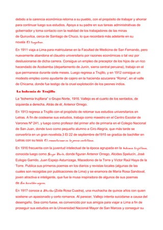 La biografía resume la vida y obra del poeta y escritor peruano César Vallejo. Nació en 1892 en Santiago de Chuco, Perú. Estudió magisterio y letras en universidades peruanas mientras trabajaba para financiar sus estudios. Publicó su primer libro de poemas Los heraldos negros en 1919 y el innovador Trilce en 1922. Viajó a Europa en 1923 y vivió en París donde pasó dificultades económicas y se involucró en el periodismo y el marxismo. Murió en París en 1938 siendo