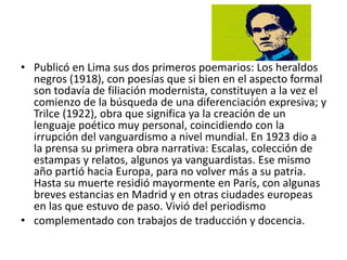 César Vallejo fue un poeta y escritor peruano considerado uno de los mayores innovadores de la poesía del siglo XX. Publicó sus primeros poemarios Los heraldos negros y Trilce en los que comenzó a desarrollar su propio y personal lenguaje poético. En 1923 se trasladó a vivir a Europa, residiendo principalmente en París, donde vivió del periodismo y la traducción hasta su muerte en 1938. Sus poemas póstumos Poemas humanos son considerados lo mejor de su obra y lo han hecho merecedor