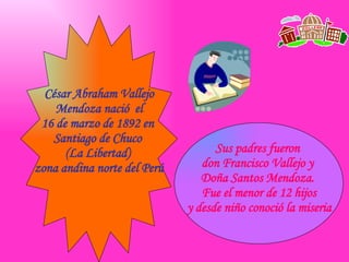 César Vallejo nació en 1892 en Perú. Estudió letras en la Universidad de Trujillo y se mudó a Lima en 1918, donde publicó su primer libro de poemas Los Heraldos Negros. Más tarde se mudó a París, donde murió en 1938. Algunas de sus obras más importantes incluyen Los Heraldos Negros, Trilce, Poemas Humanos y otros.