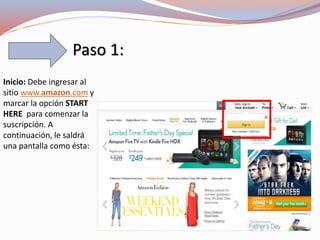 Este documento proporciona instrucciones en 4 pasos para crear una cuenta de usuario en el sitio web de Amazon.com. El primer paso indica ingresar a la página web y seleccionar la opción "START HERE". El segundo paso detalla los campos de registro requeridos como nombre, correo electrónico, número telefónico y contraseña. El tercer paso menciona un gráfico. El cuarto y último paso instruye al usuario a crear la cuenta al hacer clic en "Create account" luego de aceptar los términos y condiciones.