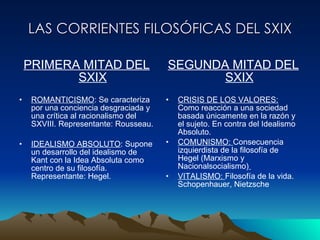 El documento resume las principales corrientes filosóficas del siglo XIX, incluyendo el romanticismo, el idealismo absoluto y el vitalismo. Describe la filosofía vitalista de Nietzsche, quien rechazaba el racionalismo en favor de la vida y la voluntad de poder. Nietzsche propuso la figura del Übermensch como máxima expresión de esta filosofía. Su obra más importante, Así Habló Zaratustra, presentó su teoría del Übermensch y la transmutación de valores.