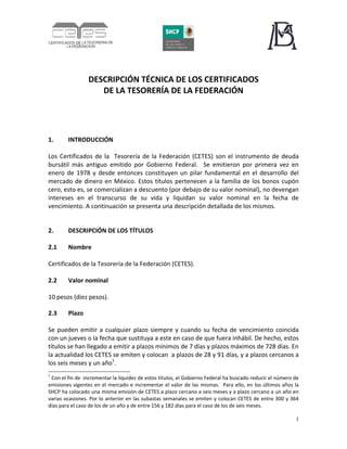 Los Certificados de la Tesorería de la Federación (CETES) son bonos emitidos por el gobierno mexicano que no generan intereses. Se emiten a plazos de entre 7 días y más de 2 años, y su valor se determina por la tasa de descuento aplicada. Los CETES se negocian principalmente en subastas primarias y en un mercado secundario activo, y juegan un papel fundamental en el desarrollo del mercado monetario mexicano.