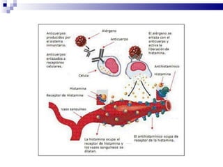 El documento describe las propiedades de la cetirizina, un antihistamínico de segunda generación. Explica que la cetirizina es un antagonista competitivo del receptor H1 de la histamina que se usa para tratar la rinitis alérgica y otros trastornos alérgicos. Proporciona información sobre su farmacocinética, efectos adversos, interacciones, dosis y contraindicaciones.
