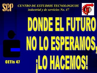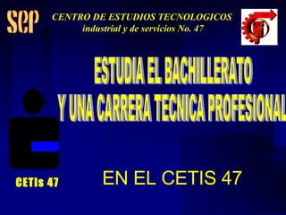 Este documento promociona el CETis 47, un centro de estudios tecnológicos que ofrece bachillerato y carreras técnicas profesionales. Describe sus instalaciones como salas de cómputo, talleres de refrigeración, mantenimiento e informática, así como actividades extracurriculares como deportes, arte y convivencia estudiantil. El CETis 47 busca formar profesionales técnicos para contribuir al desarrollo sustentable a través de más de 30 años de experiencia educativa.