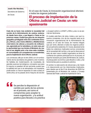 La innovación organizacional afectará a todos los órganos judiciales en Ceuta con la implantación de la Oficina Judicial. Se percibe la disposición al cambio por parte de los actores en el proceso, así como el compromiso para aceptar la nueva organización y la actitud positiva para llevarla a la práctica. El reto es lograr el éxito del nuevo modelo organizativo con el soporte del Ministerio de Justicia y los recursos económicos necesarios.