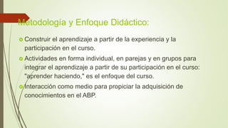 Este documento describe el uso del método de aprendizaje basado en problemas (ABP) para implementar el uso de computadoras personales en la educación. Se propone dividir a los estudiantes en grupos para que analicen los desafíos y oportunidades de esta implementación, identifiquen las debilidades y amenazas, y propongan estrategias y fortalezas. El objetivo es que los estudiantes construyan el conocimiento de forma activa y colaborativa para prepararse para el uso efectivo de la tecnología en el aula.