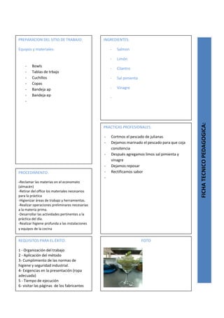 El documento habla sobre la preparación del ceviche de pescado. El ceviche se hace encurtiendo por lo menos una hora el pescado en el zumo de varios limones verdes. Puede usarse corvina de roca u otro pescado como la tilapia. Luego se agregan otros ingredientes como sal, pimienta y vinagre. El ceviche es un plato típico de varios países latinoamericanos del Pacífico.