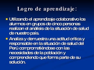 El documento presenta información sobre un análisis de la situación de salud en Perú realizado por estudiantes. Aborda factores demográficos, socioeconómicos y de oferta de servicios de salud que afectan la morbilidad y mortalidad en el país. Los estudiantes deben elaborar un cuadro sinóptico identificando los principales problemas de salud en Perú.