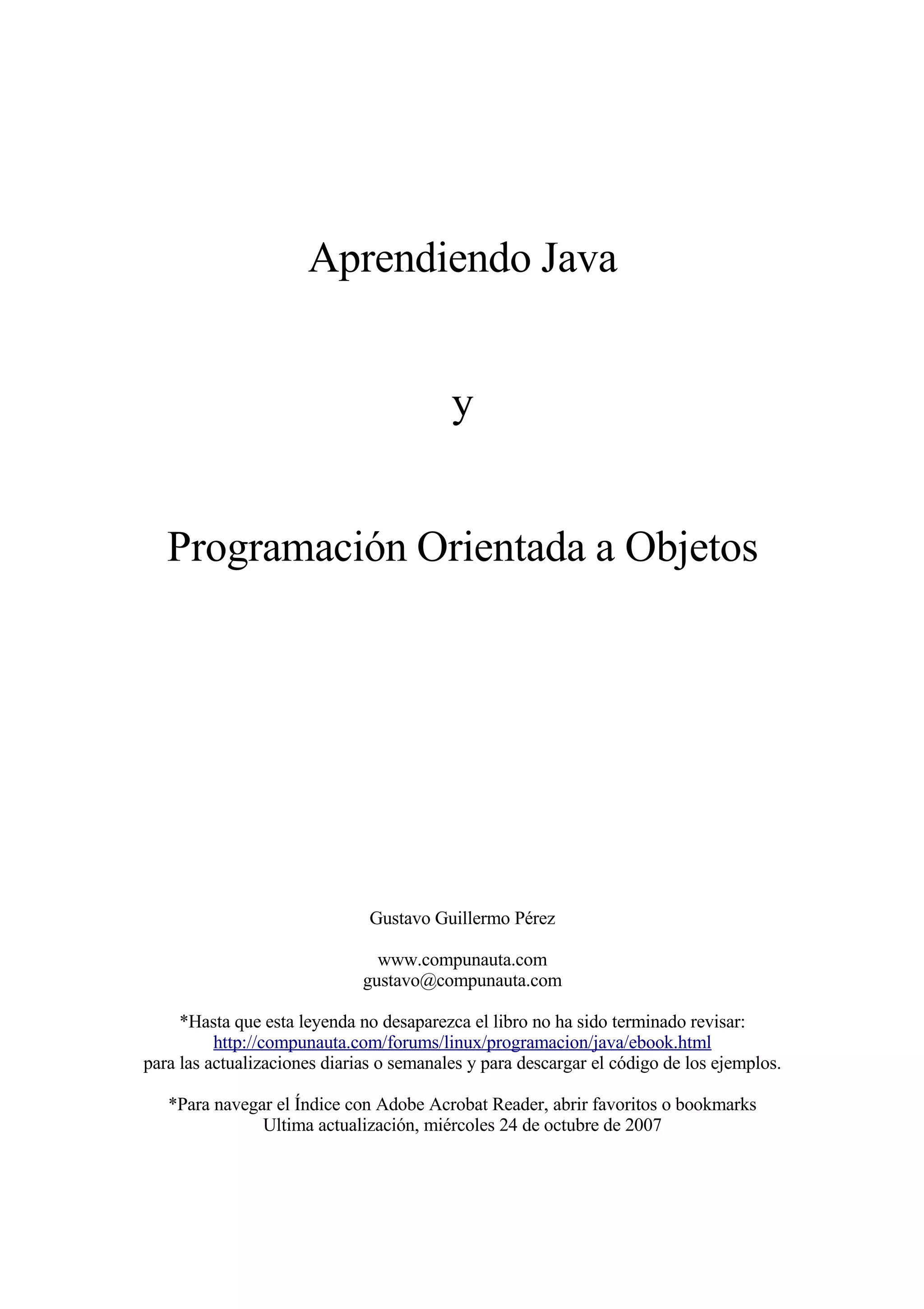 Este documento presenta una introducción a Java y programación orientada a objetos. Explica conceptos clave como la máquina virtual de Java, el kit de desarrollo y entorno de ejecución, tipos de datos básicos, operadores, nombres de variables y funciones. También cubre temas como el primer programa en Java, paquetes, palabras clave, salida e ingreso por pantalla, creación de objetos, manejo de errores y estructuras de control. Finalmente, introduce métodos estáticos, arreglos, búsqueda y ordenamiento de datos.