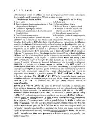 Este documento describe las propiedades de los ácidos y bases, la teoría de Arrhenius sobre la ionización de electrolitos en agua, y la teoría de Brønsted-Lowry sobre la transferencia de protones. También explica el concepto de pH, la ionización del agua, y cómo la hidrólisis puede hacer que las soluciones se vuelvan ácidas o básicas.